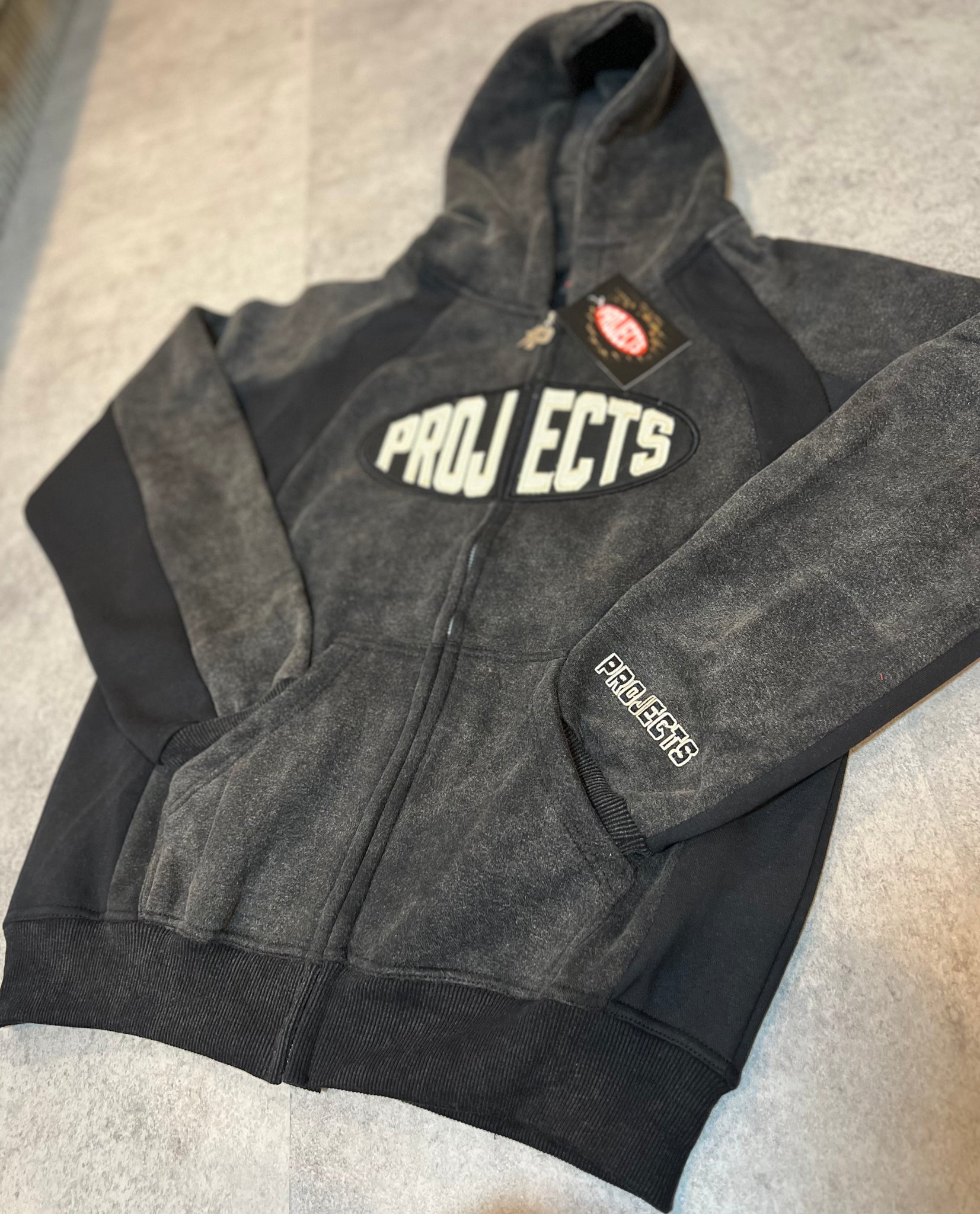 Acid black hoodie black panels 3D embroidery on chest, embroidering on sleeve and screen print on back logo zipper hardware.