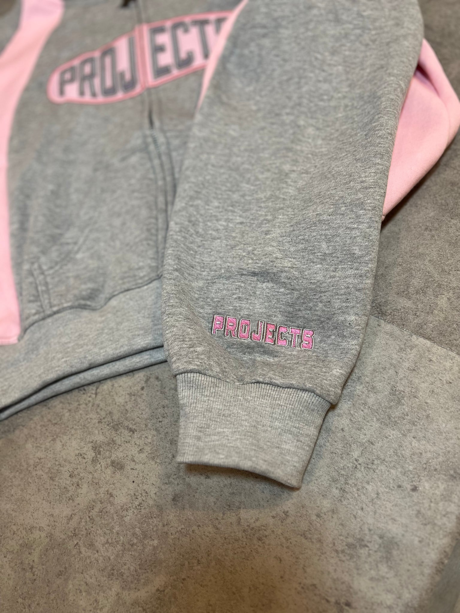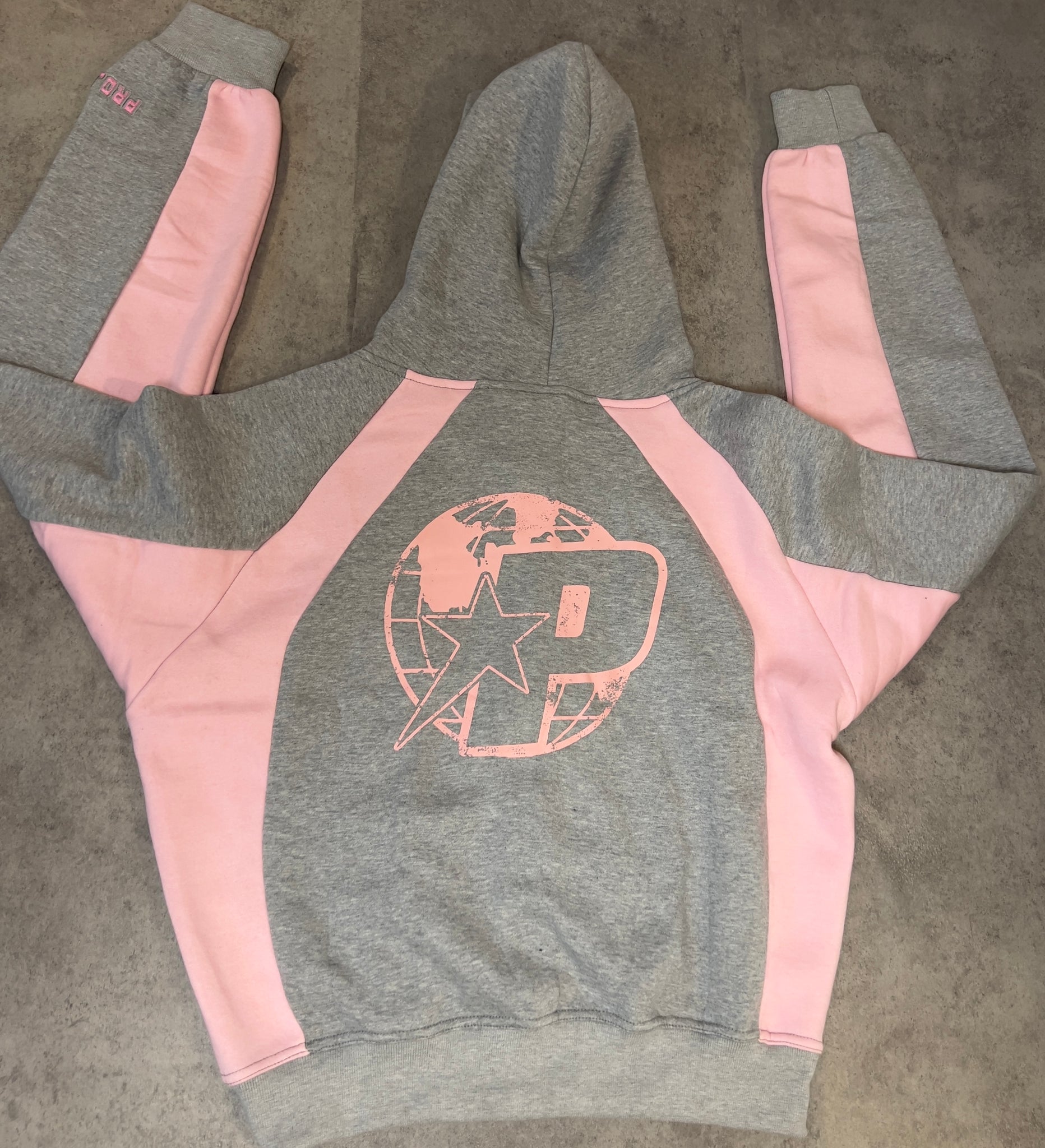 Heather hoodie pink panels 3D embroidery on chest, embroidering on sleeve and screen print on back logo zipper hardware.