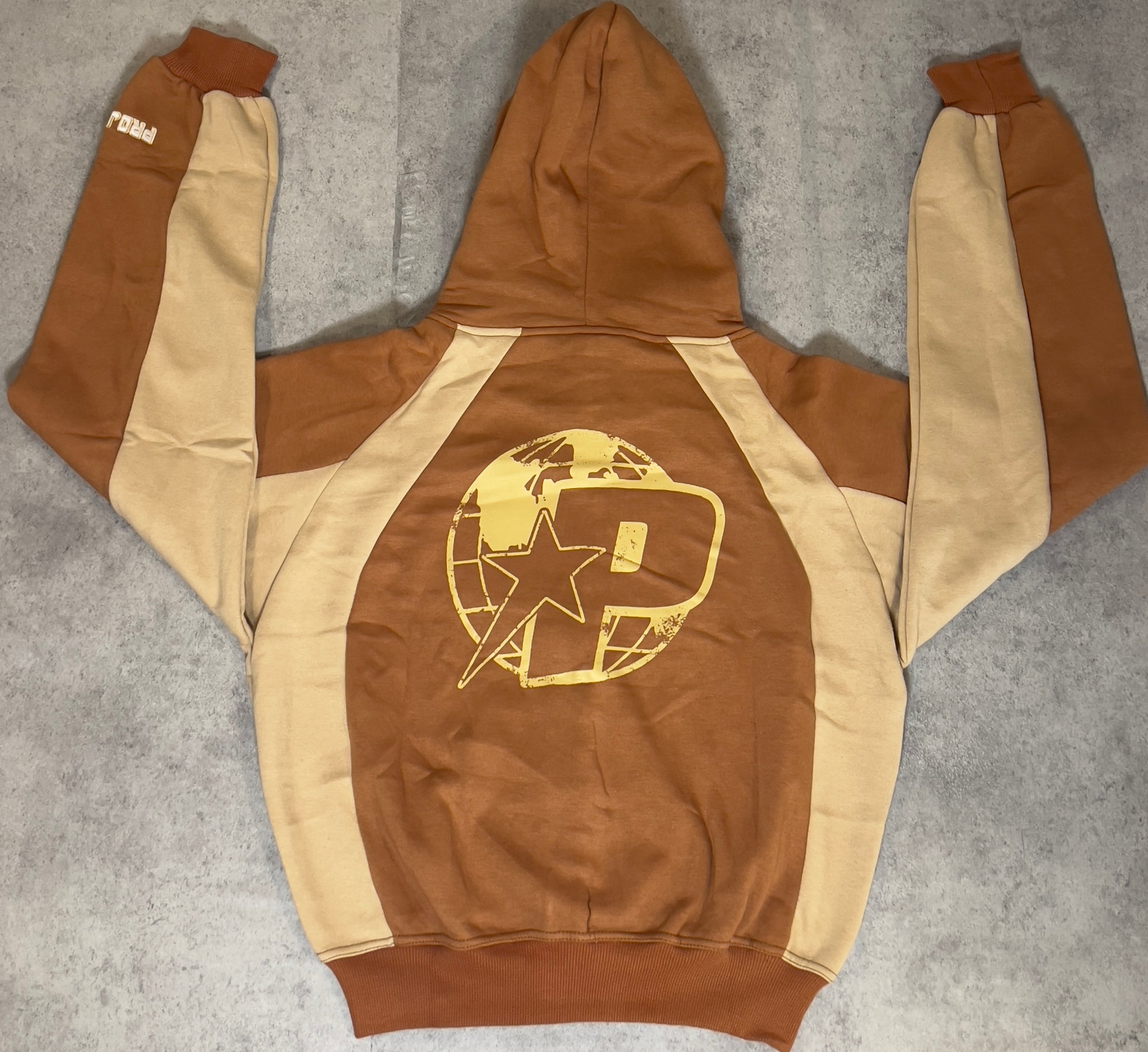 Brown hoodie tan panels 3D embroidery on chest, embroidering on sleeve and screen print on back logo zipper hardware.